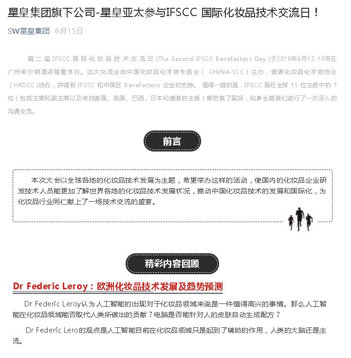 上一篇:國(guó)際化妝品化學(xué)家學(xué)會(huì)聯(lián)盟(IFSCC)主委 Vania Leite 教授一行來訪參觀星皇集團(tuán)